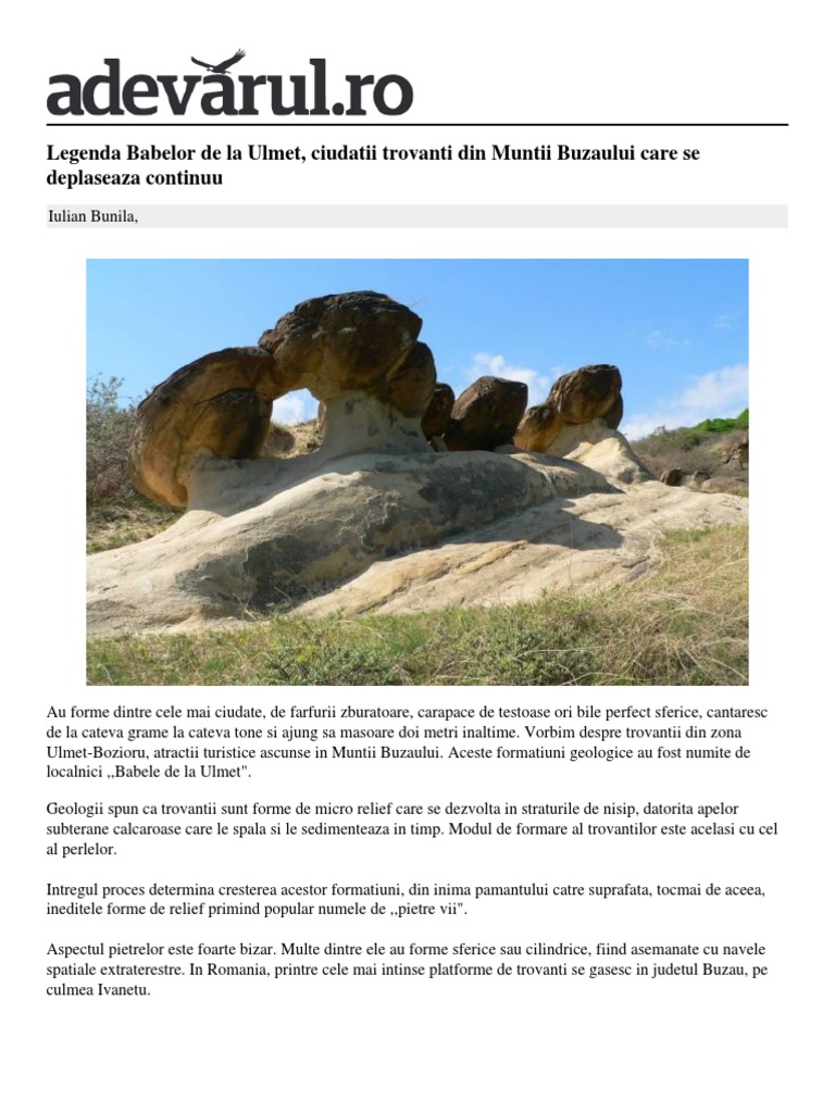 În comuna bozioru, sat ulmet se găsesc tronanţii. Learn how to create your own. Mistere de ieri si de azi. Da, și în buzău există trovanti, pe valea bâscei chiojdului, în tărâmul goșei și prin alte locuri. Corina, my wife, along with ada, had done their homework, and they kept talking about the living stones and the route up there.